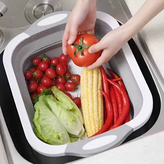 • 3-in-1 Design – Functions as a cutting board, drain basket, and collapsible vegetable basin for maximum utility.